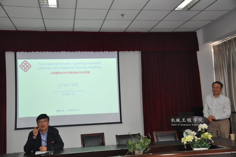 4月17日下午,香港理工大学刘扬教授应邀来yl23411永利集团官网机械工程学院作题为 “从大数据分析显示出中医阴阳五行和信号分子通路之间的高度相似性”学术报告。校长施卫东主持报告会。
