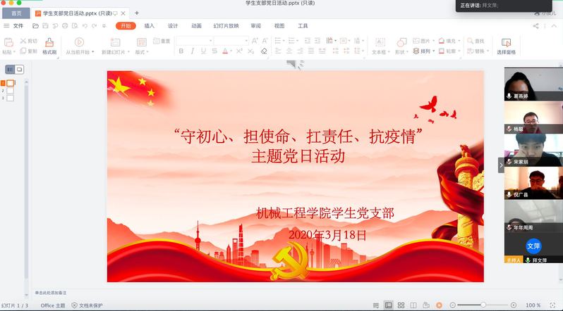 3月18日下午,机械工程学院学生党支部在线开展了“守初心、担使命、扛责任、抗疫情”线上主题党日活动。