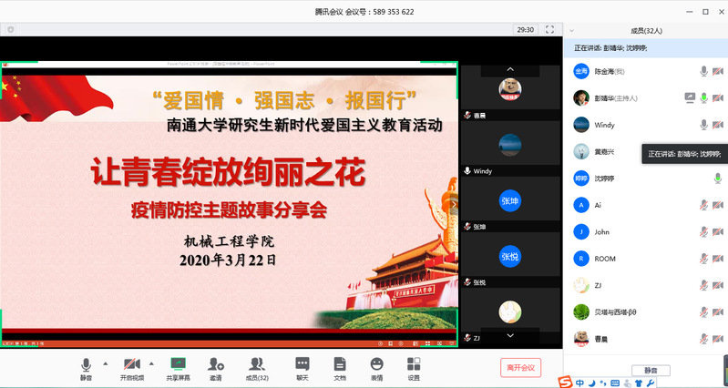 3月22日下午,机械工程学院研会与18机械研究生团支部联合开展团日活动,在线举行研究生爱国主义主题教育活动——“让青春绽放绚丽之花”疫情防控主题故事分享会。全体18级和17、19级研究生代表参加活动。