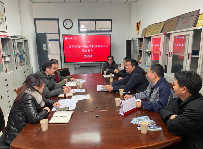 35日,汇通印刷包装机械有限公司总经理吴卫江一行来校洽谈合作交流,yl23411永利集团官网副书记、院长张福豹、yl23411永利集团官网副书记、副院长刘艳及相关人员参会。