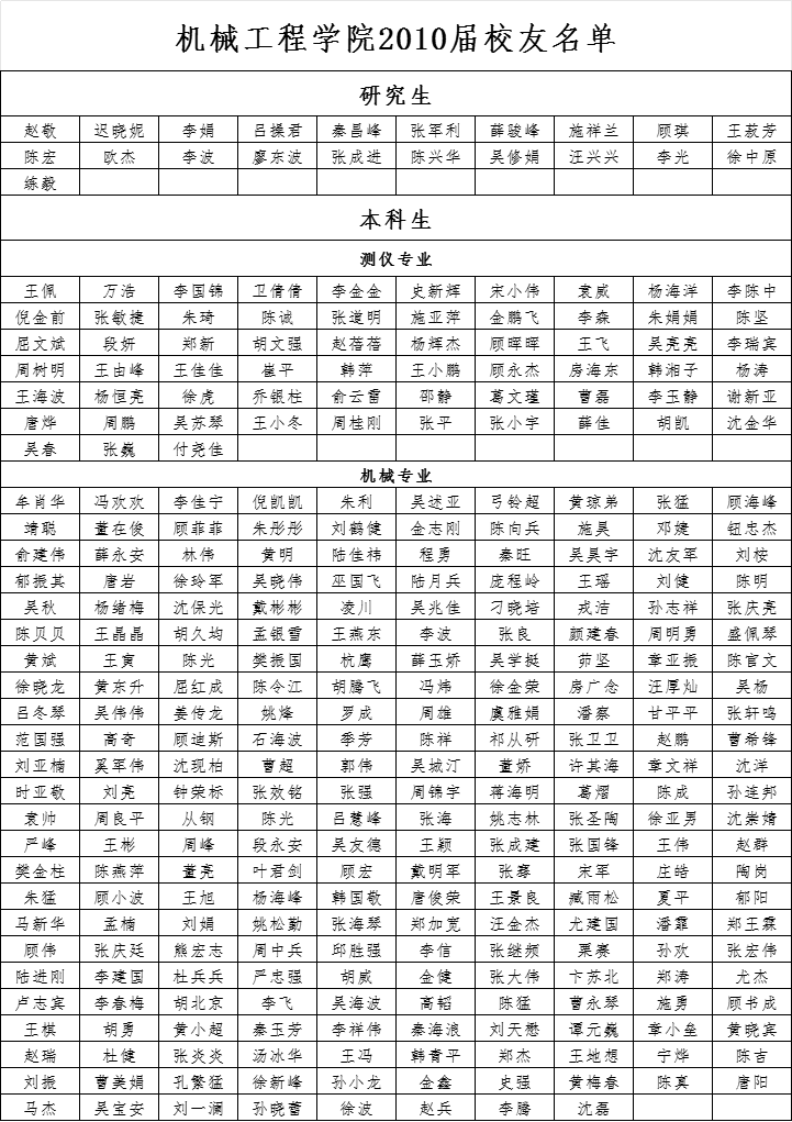 机械工程学院2010届校友名单