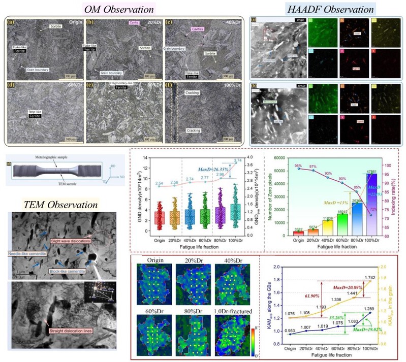 该研究系统地阐述了30Cr1Mo1V转子钢在高温疲劳下的微观缺陷形成、显微组织演变、损伤演化规律与疲劳断裂机制,并基于晶体学理论提出了一种取向差参数表征法,为精准评估转子钢的疲劳损伤程度、预测转子部件的剩余寿命提供了理论与方法支撑。
